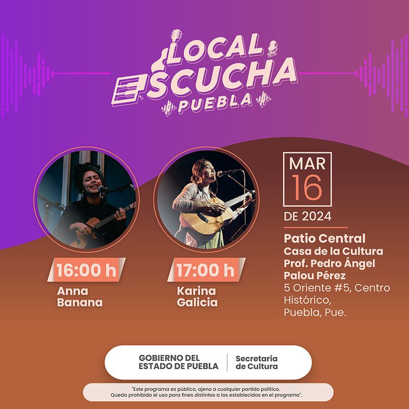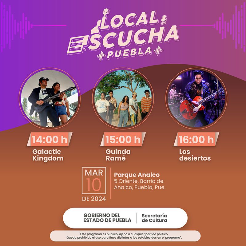La Secretaría de Cultura informa que, los días 10 y 16 de marzo, tendrán lugar cinco conciertos de artistas y grupos poblanos, como parte del programa “Local, escucha Puebla”, los cuales podrán ser presenciados de forma gratuita.