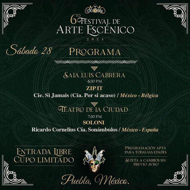 El Ayuntamiento de Puebla –que preside Adán Domínguez Sánchez– a través del Instituto Municipal de Arte y Cultura, invita a las y los poblanos, así como a visitantes a disfrutar el último fin de semana de septiembre con el Festival de Arte Escénico 2024, en el que habrá música, circo, teatro y más con entrada libre.