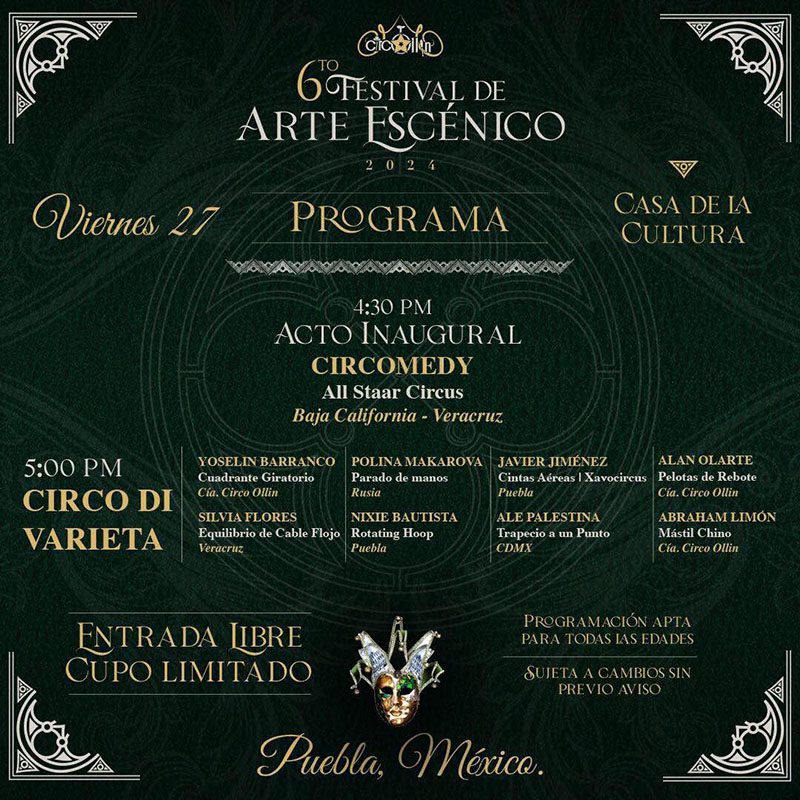 Este viernes 27, inician las actividades en Casa de Cultura, a las 17:00 horas, inicia Yoselin Barranco con Cuadrante Giratorio; Silvia Flores con Equilibrio de Cable Flojo; Polina Makarova con Parado de manos; Nixie Bautista con Rotating Hoop; Javier Jiménez con Cintas Aéreas; Diana Batres con Fuerza Capilar; Ale Palestina con Trapecio a un Punto; Alan Olarte con Pelotas de Rebote y Abraham Limón con Mástil Chino. Además, el Teatro de la Ciudad se convertirá en circo- teatro con la presentación de Pytu Ymágui de Félix Salas a las 19:00 horas.