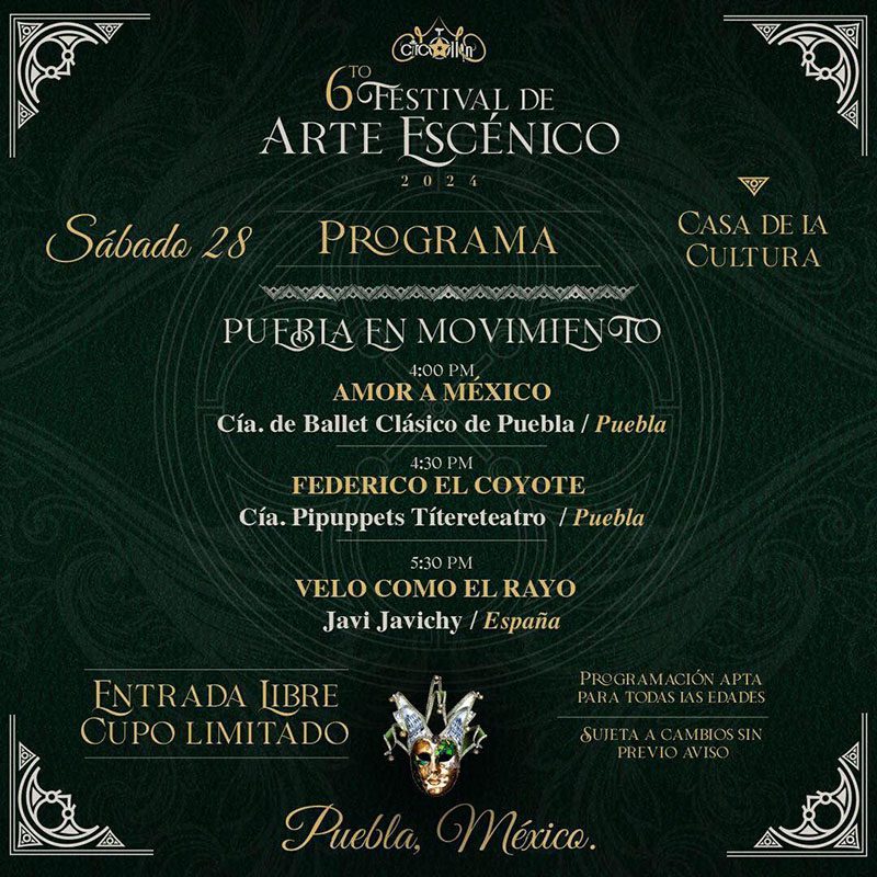 El sábado 28 en Casa de Cultura a las 16:00 horas se presentará el Ballet Clásico Poblano “Amor a México”; a las 16:30 horas la Cía.Pipuppets Títereteatro brindará diversión y entretenimiento con la historia de «Federico el coyote» y a las 17:30 horas se presenta el artista español Javi Javichy con la obra «Velo como el rayo».