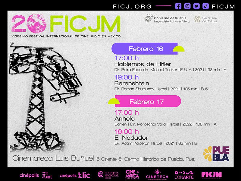 La Cinemateca “Luis Buñuel” (ubicada en 5 Oriente número 5, Centro Histórico) será parte del vigésimo Festival Internacional de Cine Judío en México (FICJM), con la proyección de siete largometrajes los días 16, 17, 18, 21 y 22 de febrero, informa la Secretaría de Cultura.