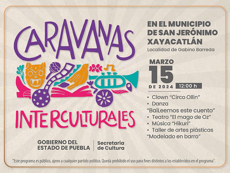 El programa “Caravanas Interculturales” visitará la localidad Gabino Barreda del municipio de San Jerónimo Xayacatlán, en la región Mixteca poblana, este viernes 15 de marzo a partir de las 12:00 horas, informa la Secretaría de Cultura.