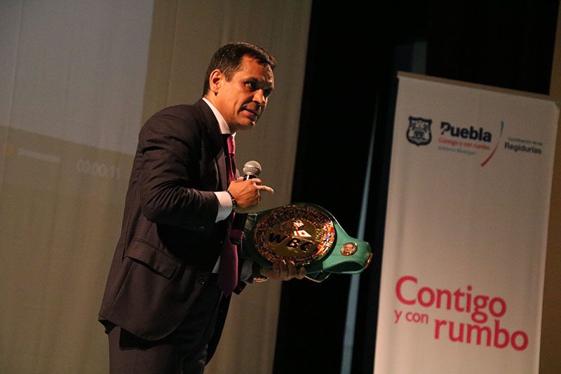 Sumar a nobles causas en beneficio de la sociedad es compromiso del Ayuntamiento de Puebla -presidido Eduardo Rivera Pérez-, por ello la Comisión de Participación Ciudadana en el Cabildo capitalino -a cargo del regidor Alfredo Ramírez Barra- y el Instituto Municipal del Deporte -encabezado por Antonio Iriarte González- presentaron la conferencia ‘A Dios Rogando y con los Guantes Dando’, impartida por el exboxeador Ricardo “El Finito” López.