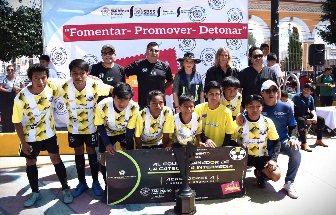 Luego de una emocionante final, la presidenta municipal de San Pedro Cholula, Paola Angon Silva, encabezó la ceremonia de premiación del Torneo de Barrios «Sal a tu Calle», que reunió a niñas, niños y jóvenes de la cabecera municipal, en una competencia de fútbol.