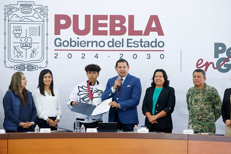 Durante la conferencia de prensa, el gobernador del estado de Puebla, Alejandro Armenta, reconoció el esfuerzo y los resultados del deportista Pedro Armenta Campos, exponente del Frontón poblano, quien obtuvo la medalla de plata en la modalidad de Paleta Goma Tres Paredes, categoría Juvenil B (16-17 años), en la Olimpiada Nacional CONADE 2025.
