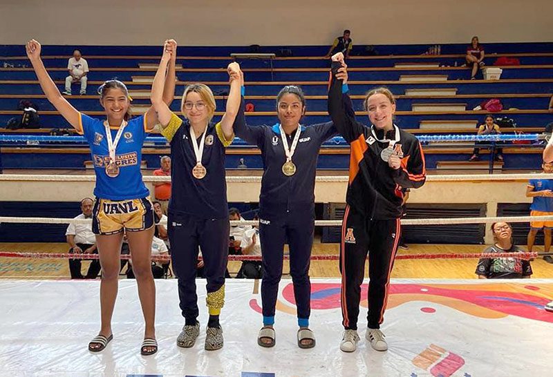 En el último día de competencias, la Máxima Casa de Estudios en Puebla sumó seis medallas en kick boxing: Fátima Ramos López, de la Facultad de Cultura Física, se llevó el oro; Arleth Godos Parianez, de la Facultad de Ciencias Físico Matemáticas, plata; Bleady Nahomi Dorantes García, de la Facultad de Artes, plata; y Evelyn Tlapayatlacomulco, de la Facultad de Derecho, bronce.