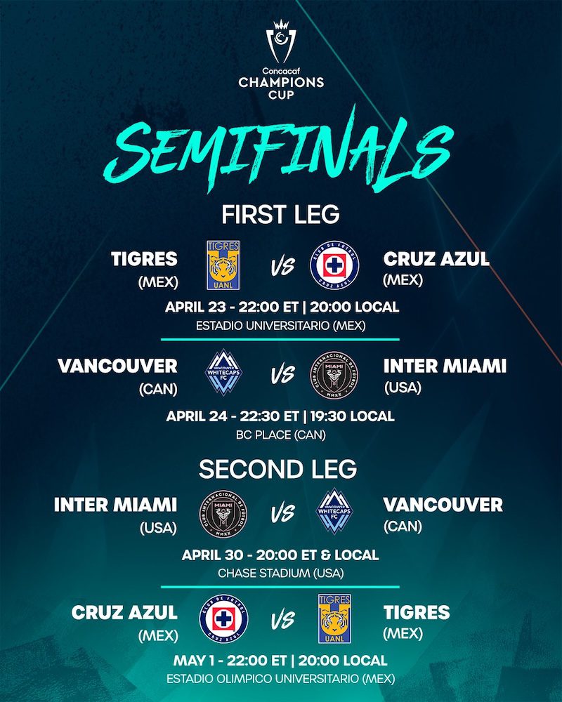 Vancouver enfrentará en la ida el jueves 24 de abril, a las 22:30, en el BC Place, en Canadá. El duelo de vuelta se jugará el miércoles 30 de abril a las 20:00 horas el Chase Stadium, en Fort Lauderdale, Florida.