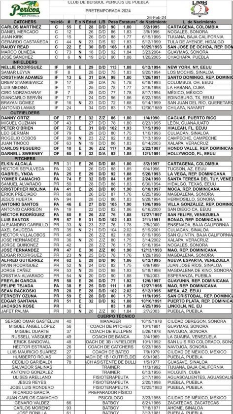 El Club Pericos de Puebla anuncia de manera oficial, el roster que reportará para el inicio de la pretemporada 2024.