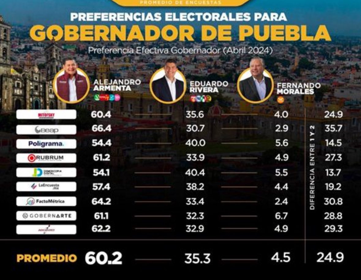 La diferencia entre los candidatos a la gubernatura sería de 25 puntos porcentuales según la preferencia efectiva, que elimina a los entrevistados que no declararon el sentido de su voto (12.1%); con estas tendencias electorales se refleja muy difícil el escenario para Eduardo Rivera y se vuelve a un más complicado si se analiza con números fríos.