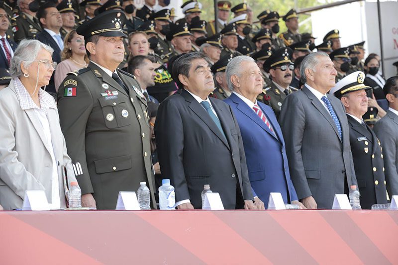 Este acto, que reflejó la importancia de la entidad para el país y tuvo como recorrido del Mausoleo al General Ignacio Zaragoza a la 25 Oriente y Bulevar 5 de Mayo, comenzó con un agrupamiento de banderas y de batallones; asimismo con el paso de integrantes del Sexto Regimiento, del Heroico Colegio Militar, Fuerzas Especiales y de la Secretaría de Marina.