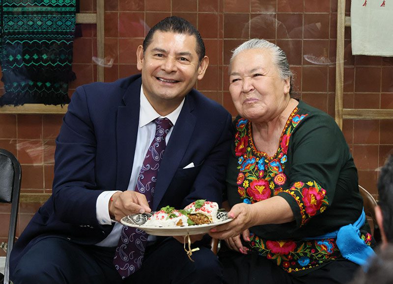 Acompañado por cocineras tradicionales, artesanos productores de la marca “Puebla Cinco de Mayo” y funcionarios de su gabinete, el mandatario Alejandro Armenta resaltó que el Chile en Nogada le da identidad al Estado y a nuestro país, pues es sabor y color, además de representar a uno de los platillos tradicionales que aún conserva elementos artesanales en su preparación.