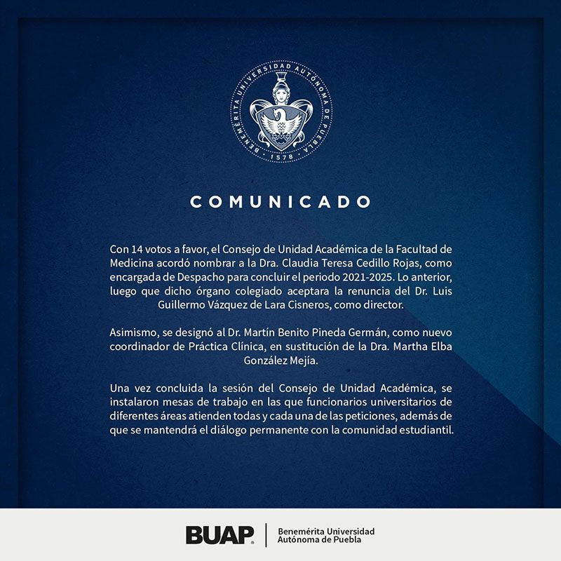 El martes por la mañana, un grupo de estudiantes sostuvo un diálogo con representantes de la BUAP, donde se les informó sobre la renuncia de Vázquez de Lara tras una sesión del Consejo de Unidad Académica. Sin embargo, la designación de Cedillo generó inconformidad entre los estudiantes en paro, quienes exigieron que Yolanda Martínez, su candidata, fuera nombrada en el cargo de manera provisional hasta la realización de elecciones formales.