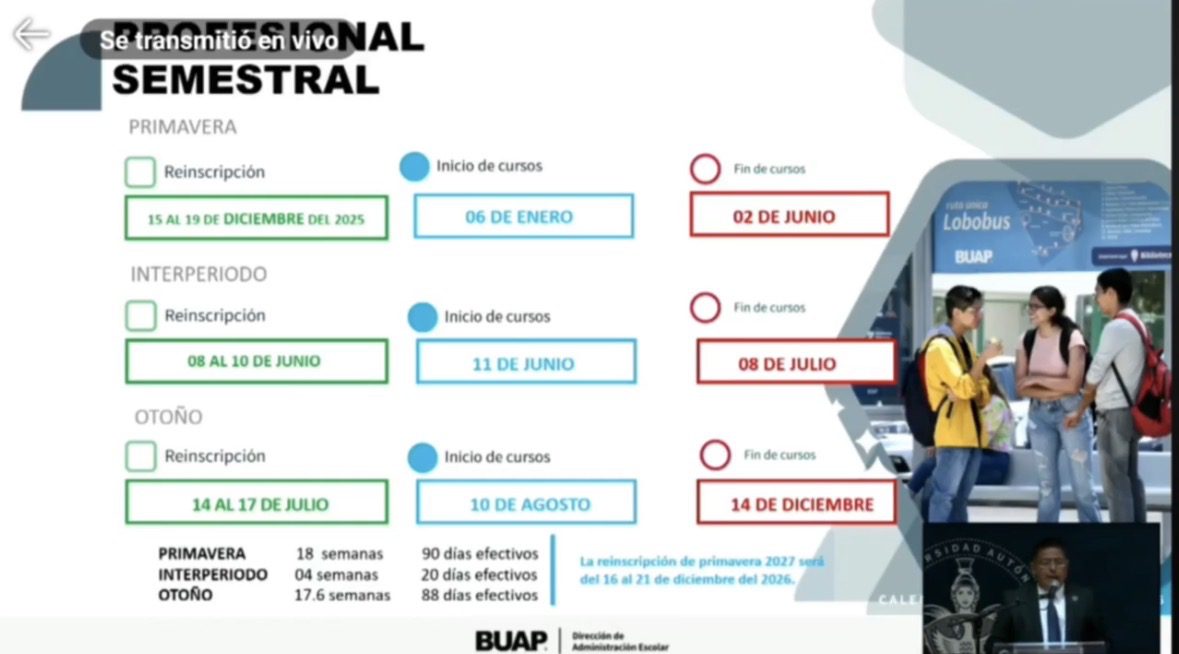 Con 183 votos a favor, el Consejo Universitario de la Benemérita Universidad Autónoma de Puebla (BUAP) aprobó los calendarios escolares para bachilleratos, nivel profesional y posgrados correspondientes al año 2026, los cuales contemplan 16 días inhábiles y tres periodos vacacionales que suman 30 días hábiles.
