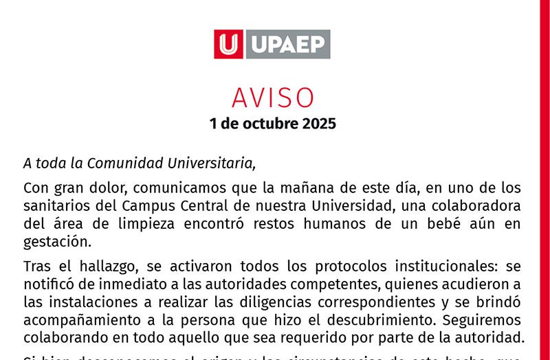 La Universidad Popular Autónoma del Estado de Puebla (UPAEP) informó sobre el hallazgo de restos humanos de un bebé aún en gestación en uno de los sanitarios de su Campus Central.