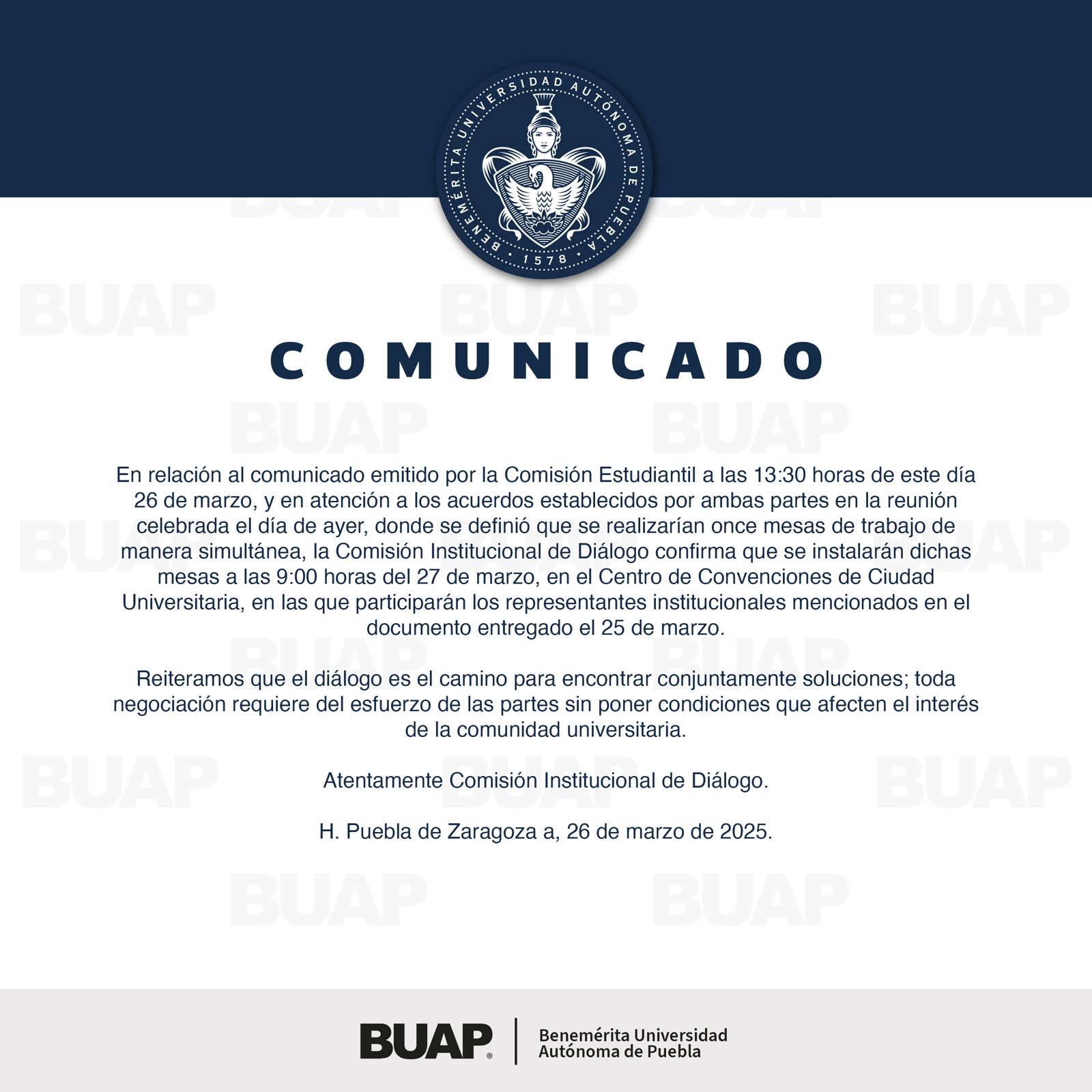 Por lo que, mediante un comunicado difundido vía redes sociales de la BUAP, se informó que, en dichas mesas participarán los representantes institucionales señalados en el documento entregado el 25 de marzo.