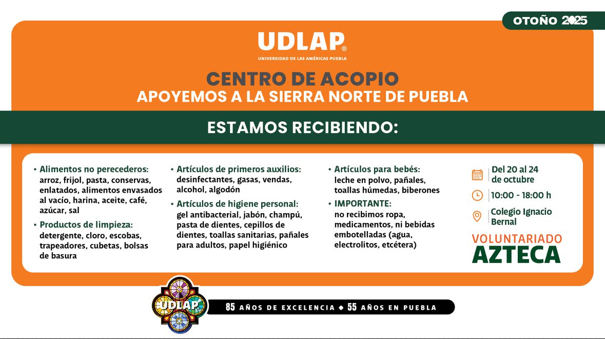 Como institución educativa, la UDLAP lleva la responsabilidad de formar no solo profesionales, sino ciudadanos comprometidos con su entorno; por ello, en un trabajo en conjunto, Voluntariado Azteca UDLAP y Banco de Alimentos, Cáritas Puebla, se unen a este esfuerzo de apoyo a los afectados por las inundaciones, al abrir un centro de acopio que estará ubicado en el Colegio Ignacio Bernal, el cual se encuentra al interior de la institución, donde se recibirán las donaciones del lunes 20 de octubre y hasta el viernes 24 de octubre, en un horario de 10:00 a 18:00 horas.