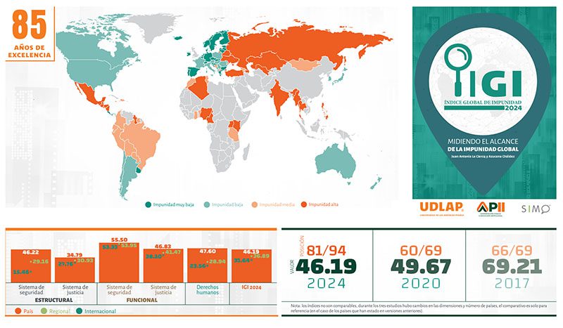 El Instituto de Investigación en Administración Pública e Innovación Institucional (APII) de la Universidad de las Américas Puebla (UDLAP), realizó la cuarta edición del Índice Global de Impunidad IGI 2024, documento que presenta cifras actualizadas del impacto de la impunidad global por país, en continuación a las ediciones desarrolladas en el 2015, 2017 y 2020.