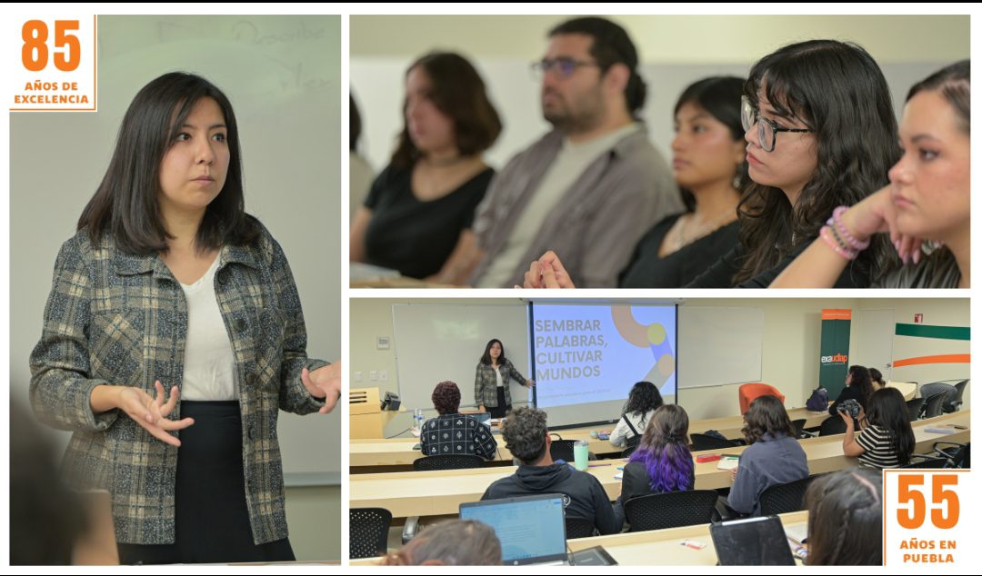 Posteriormente, la Mtra. Olivia Nicté Toxqui Martínez, destacada egresada de la Licenciatura en Literatura de la UDLAP, presentó su proyecto “Sembrar Palabras y Cultivar mundos”, realizado el año pasado en el CBTIS 142. En este proyecto, Nicté identificó rezagos en comprensión lectora y redacción tras la pandemia, y diseñó un “aula viva” que convirtió la riqueza natural del plantel en un recurso pedagógico.