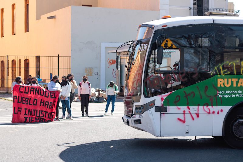 La protesta comenzó alrededor de las 14:00 horas con el bloqueo del bulevar 5 de Mayo, a la altura de la iglesia de San Francisco. Las manifestantes utilizaron tres camiones de transporte turístico para obstruir la vialidad y visibilizar sus demandas.