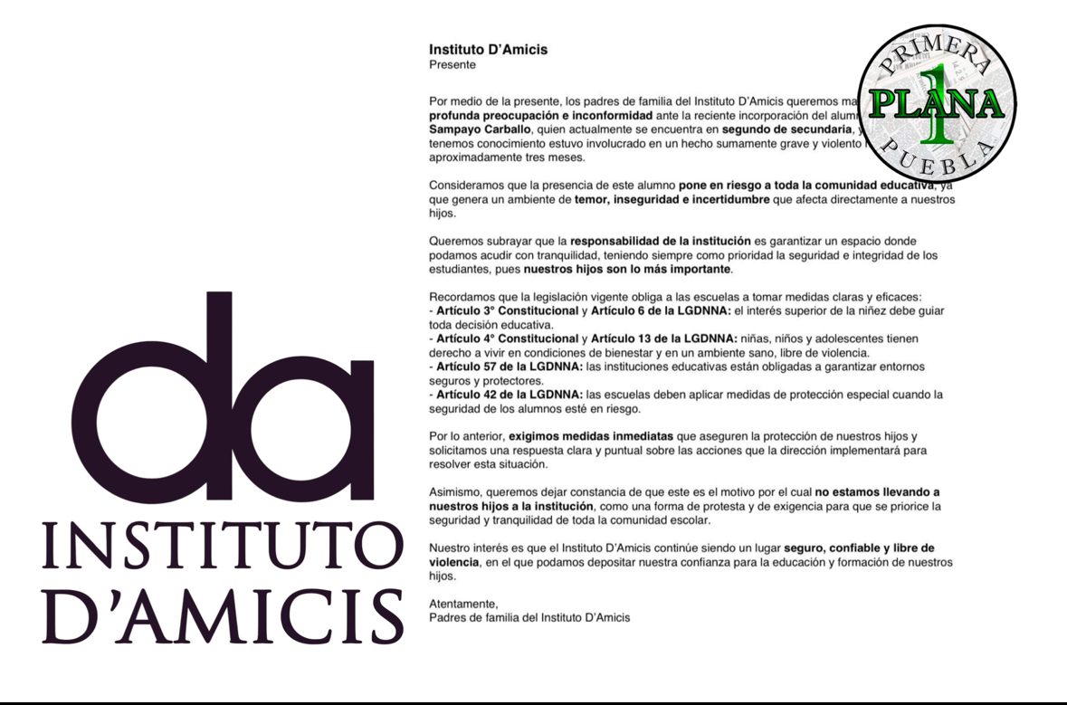 Los padres de familia del Instituto D’Amicis han alzado la voz contra la posible incorporación de un nuevo alumno, un menor de edad que enfrenta un proceso legal por un homicidio ocurrido en Lomas de Angelópolis el pasado mes de marzo.