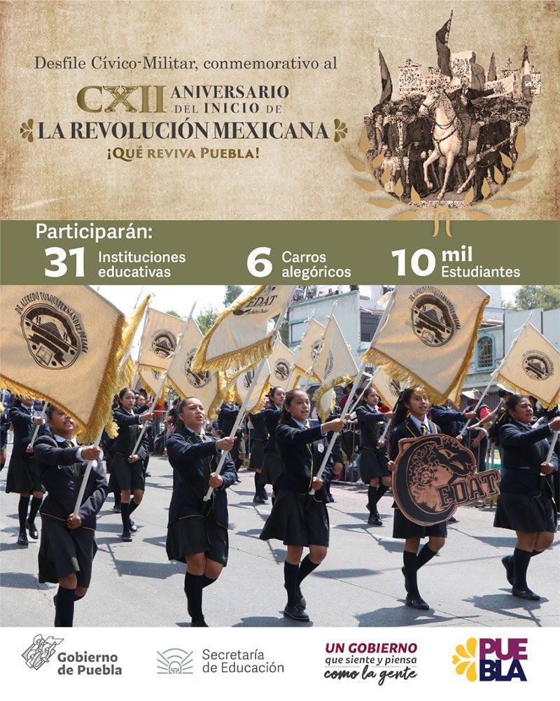 Con la finalidad de revalorizar la conmemoración del movimiento revolucionario, la Secretaría de Educación organiza el Desfile Cívico-Militar conmemorativo al “CXII Aniversario del Inicio de la Revolución Mexicana”, a efectuarse este domingo 20 de noviembre a las 10:00 horas, además fomenta en las y los estudiantes el desarrollo de la consciencia histórica.