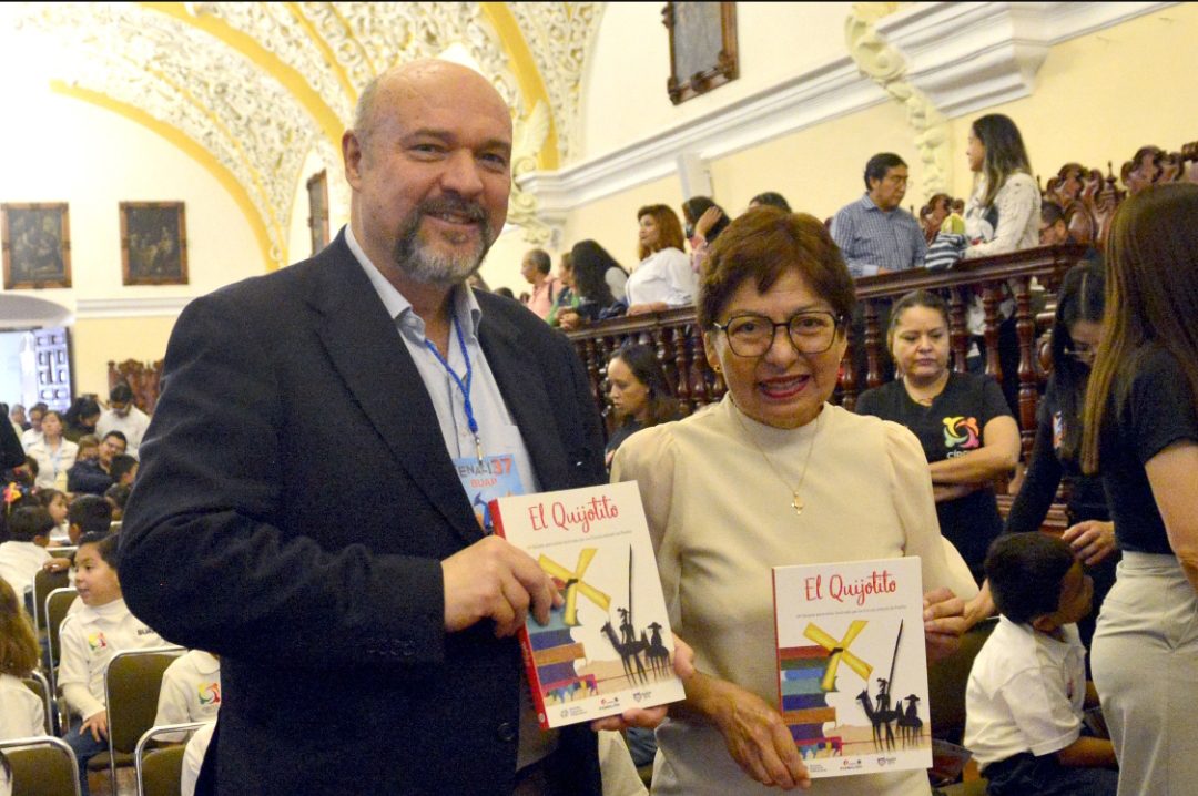 Escuchar, imaginar e interpretar las aventuras y añoranzas del ingenioso Don Quijote de la Mancha es un ejercicio que 72 niños del Círculo Infantil de la BUAP realizaron para ilustrar la obra El Quijotito, un libro que contiene una adaptación de este clásico de la literatura española, el cual fue presentado por la rectora María Lilia Cedillo Ramírez en el Salón Barroco del Edificio Carolino, en el marco de la Feria Nacional del Libro (Fenali 37).