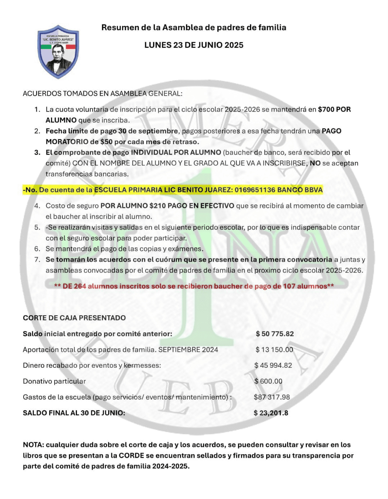 De acuerdo con los acuerdos tomados en la asamblea realizada el 23 de junio, la cuota de inscripción se fijó en 700 pesos por alumno, con fecha límite de pago el 30 de septiembre. En caso de retraso, se aplicará un cargo moratorio de 50 pesos mensuales. Los pagos deben realizarse mediante voucher bancario a nombre del estudiante y grado escolar, aunque no se aceptan transferencias electrónicas.