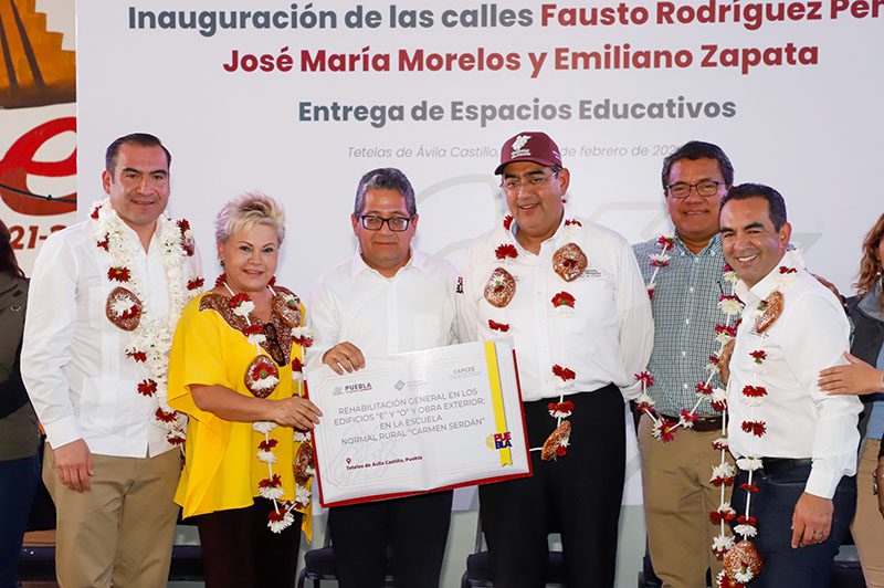 Durante su visita a Teteles de Ávila Castillo, Sergio Salomón también presidió el inicio de obras, así como la entrega de acciones para el bienestar de las familias y constancia de rehabilitación de espacios educativos a la Escuela Normal Rural «Carmen Serdán».