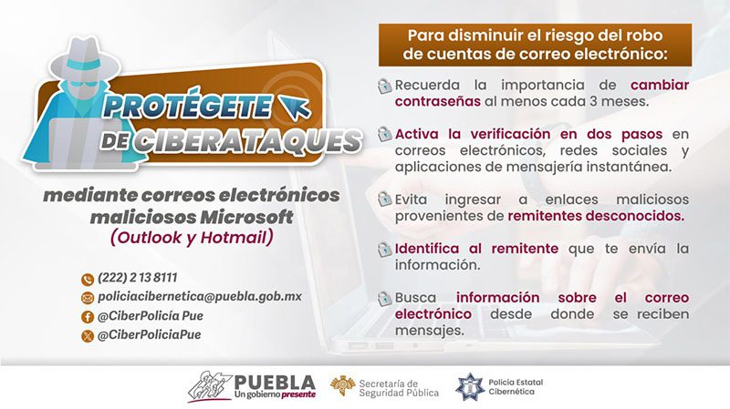 El gobierno presente de Sergio Salomón, a través de la Secretaría de Seguridad Pública (SSP), alerta a la ciudadanía sobre correos electrónicos maliciosos que buscan vulnerar perfiles de redes sociales vinculados a estas cuentas.