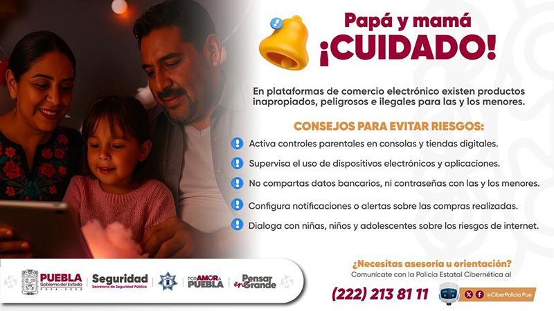El Gobierno del Estado de Puebla, a través de la Secretaría de Seguridad Pública (SSP), alerta a madres y padres de familia sobre los riesgos que existen para menores de edad en las plataformas de comercio electrónico.