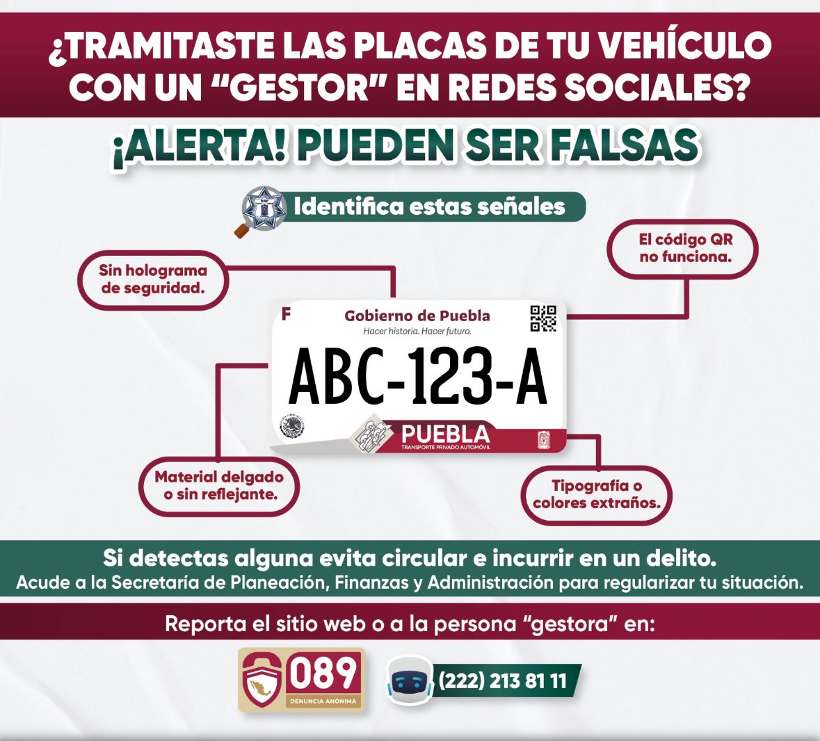 El Gobierno del Estado de Puebla, a través de la Secretaría de Seguridad Pública (SSP), alerta a la ciudadanía sobre los riesgos de tramitar placas de circulación mediante redes sociales con “gestores o coyotes”.