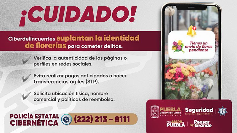 Ante el aumento de la actividad comercial por el “Día de las Madres”, el Gobierno del Estado de Puebla a través de la Secretaría de Seguridad Pública (SSP), alerta a la población sobre la suplantación de sitios web y perfiles en redes sociales de establecimientos como florerías.