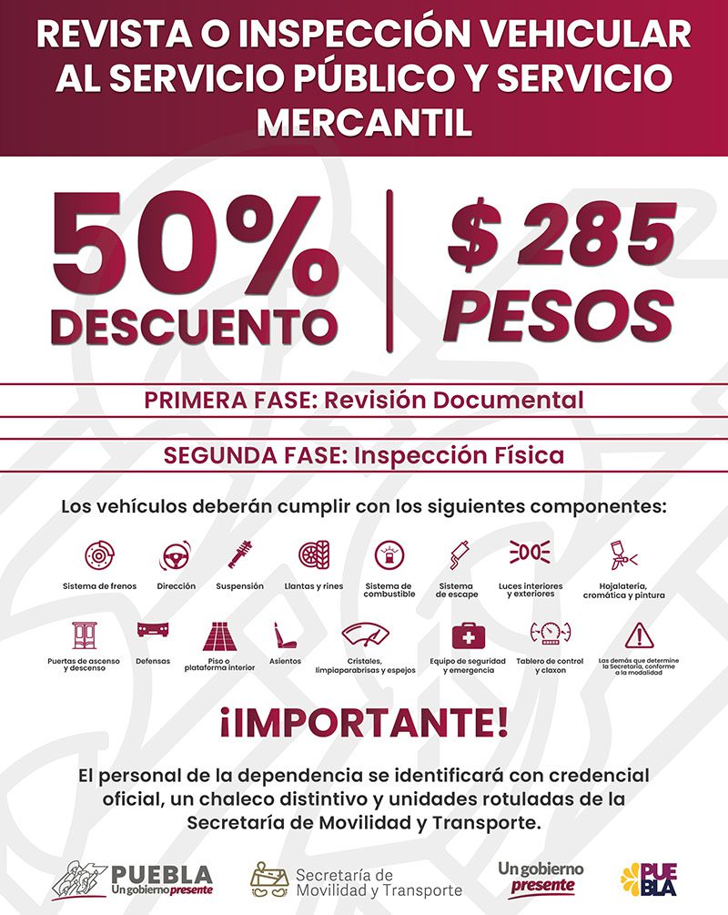 El gobierno presente de Sergio Salomón, a través de las secretarías de Movilidad y Transporte (SMT) y de Planeación y Finanzas (SPF), habilitó un descuento del 50 por ciento en el pago de derechos por el análisis tendiente a verificar que los vehículos destinados al servicio público de transporte, al servicio mercantil de transporte de personas y de carga, así como al servicio ejecutivo, cumplen con las características y condiciones físico-mecánicas para prestar el servicio respectivo.