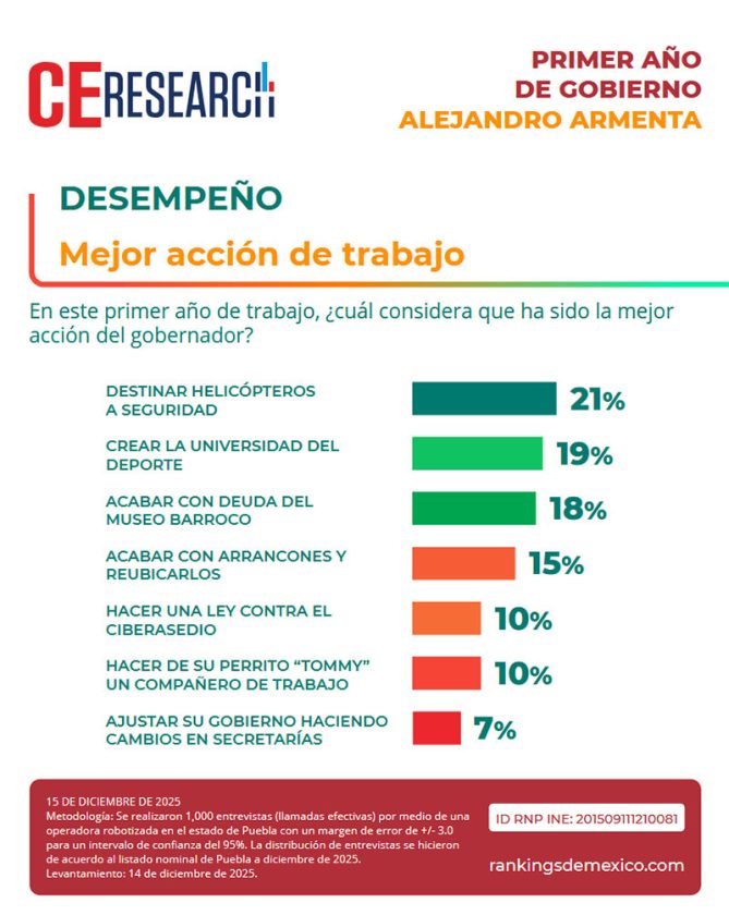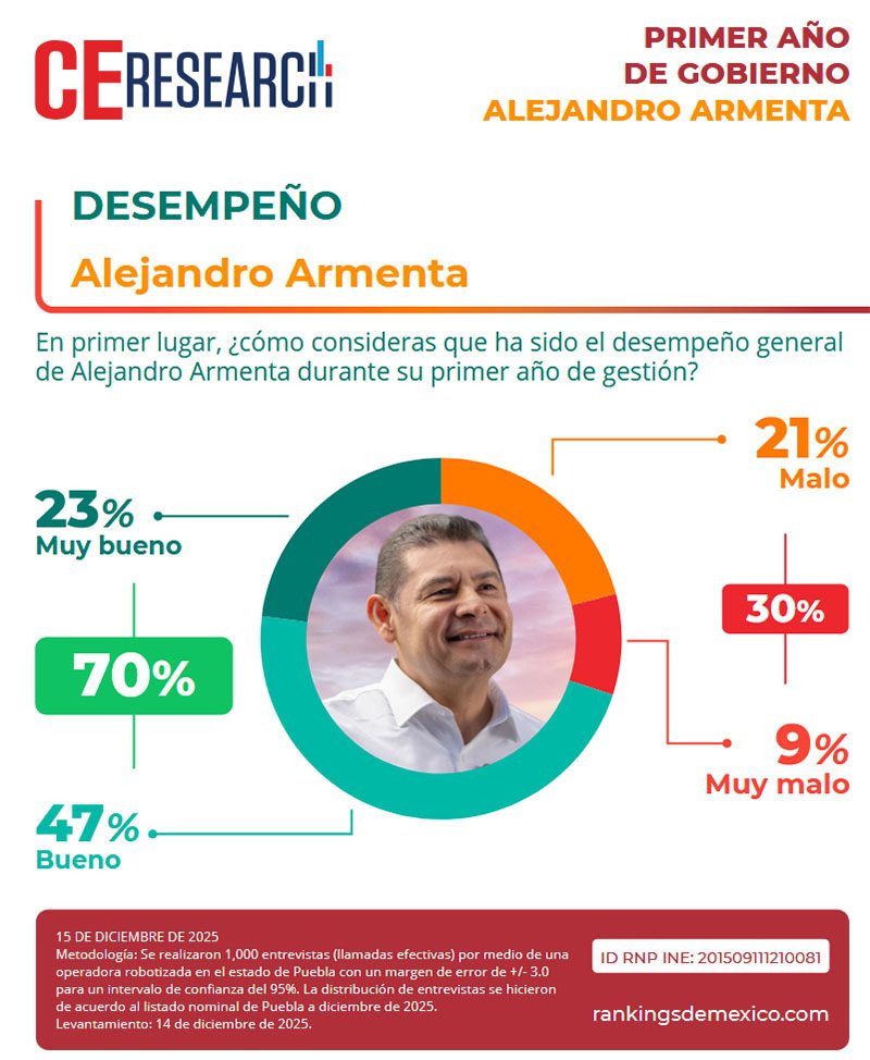 El gobernador Alejandro Armenta llega a su primer año con un índice de aprobación impresionante, de alrededor del 70 por ciento, según un informe de Campaigns and Elections (C&E). Siete de cada diez poblanos calificaron su desempeño general durante su primer año como bueno (47%) o muy bueno (23%).
