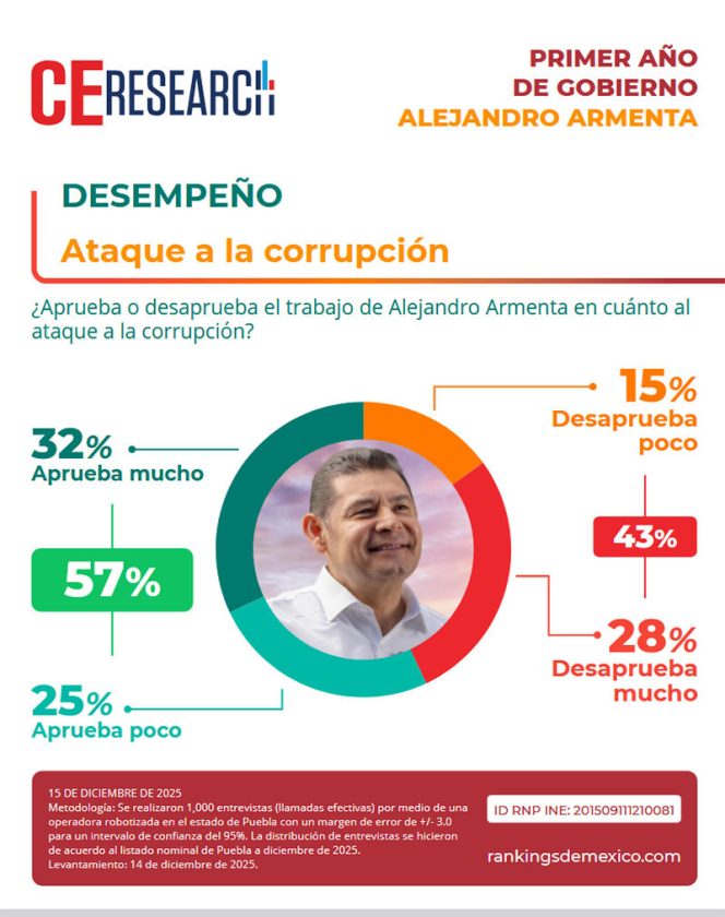 Sin embargo, hay áreas que requieren atención, ya que problemas de gran importancia nacional, como la inseguridad y la corrupción, persisten como pendientes. Si bien el 56% aprueba el trabajo del mandatario estatal en materia de seguridad, casi la mitad (44%) lo desaprueba. Del mismo modo, los esfuerzos del gobierno para combatir la corrupción se enfrentan a desafíos, con el 43% de los poblanos expresando su desaprobación.