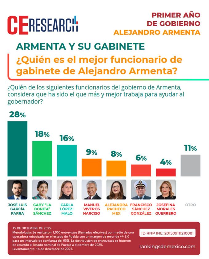 Finalmente, Campaigns and Elections (C&E) encuestó a la gente sobre el mejor gobernador de Puebla. Sorprendentemente, uno de cada tres votó por el difunto Rafael Moreno Valle, quien quedó en primer lugar. El exgobernador Sergio Salomón quedó en segundo lugar. La firma de Alejandro Rodríguez realizó una encuesta telefónica a mil personas el 14 de diciembre. La encuesta tiene un margen de error de +/- 3.0 y un intervalo de confianza del 95%.