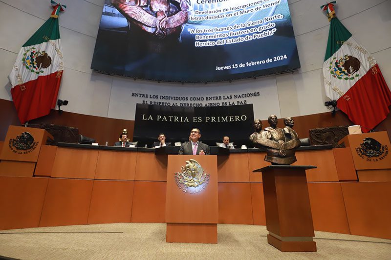 El gobernador Sergio Salomón asistió a la ceremonia solemne para develar, en el Muro de Honor del Senado de la República, la inscripción en letras doradas de la leyenda: “A los tres Juanes de la Sierra Norte, Beneméritos Ilustres en grado heroico del Estado de Puebla”, Juan Nepomuceno Méndez, Juan Crisóstomo Bonilla y Juan Francisco Lucas.