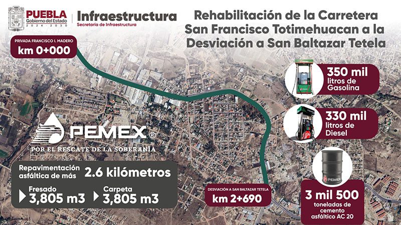 El titular de la Secretaría de Infraestructura del estado de Puebla, José Manuel Contreras de los Santos, informó un avance del 98 por ciento en la pavimentación de los 2.69 kilómetros de la carretera a San Francisco Totimehuacán. Este martes iniciarán los trabajos de pavimentación de las laterales de la recta a Cholula en ambos sentidos, en beneficio de 9 municipio aledaños.