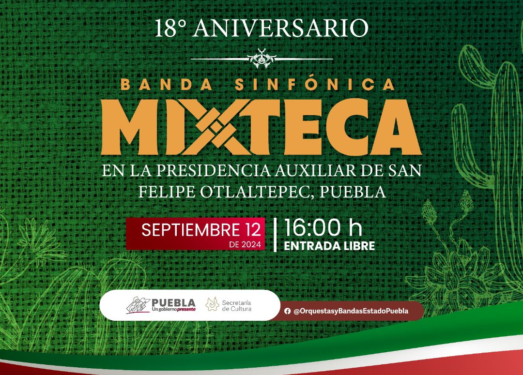 La Banda Sinfónica Mixteca, impulsada por el gobierno presente de Sergio Salomón a través de la Secretaría de Cultura, celebrará 18 años de trayectoria con un concierto de aniversario en la localidad de San Felipe Otlaltepec, perteneciente a Tepexi de Rodríguez, municipio sede de dicha agrupación.