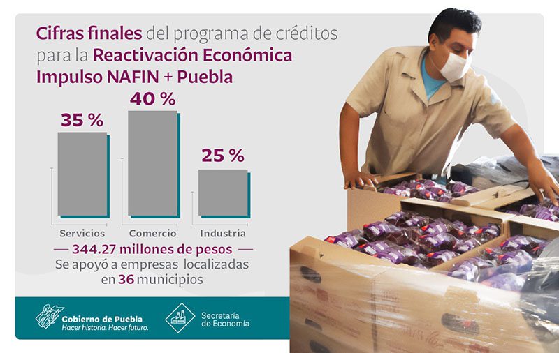 Con el apoyo a 168 empresas, el programa Impulso NAFIN + Puebla concluyó con una bolsa de 344 millones 270 mil pesos, lo anterior como parte de las acciones que impulsó el gobierno de Miguel Barbosa Huerta para contrarrestar los efectos por la pandemia por la COVID-19, informó la Secretaría de Economía.