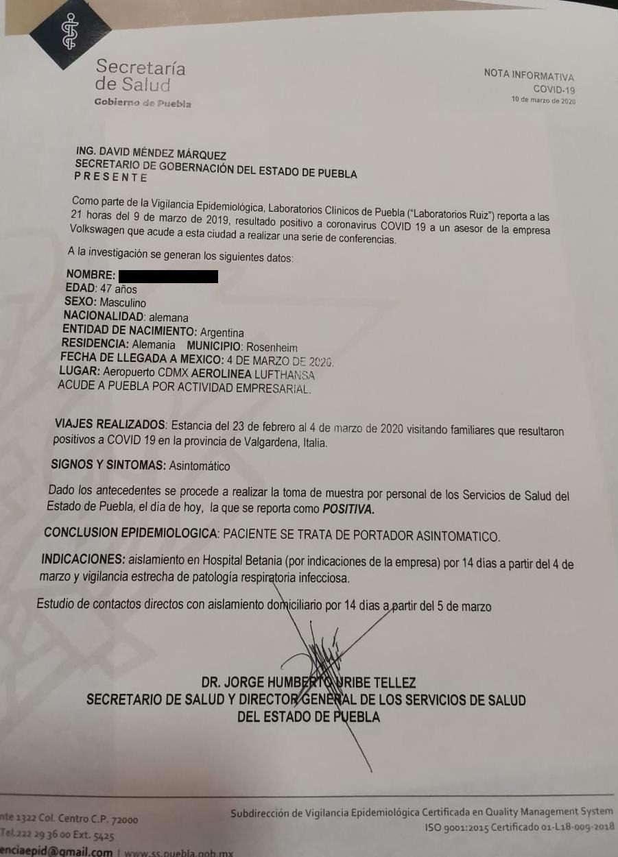 Al ser alertados por el equipo de Seguridad y Salud Ocupacional de la empresa, de inmediato se aisló a esta persona y actualmente se encuentra en un Hospital privado de la Ciudad de Puebla, hasta confirmar oficialmente los resultados de las pruebas aplicadas. Hemos estado trabajando en coordinación con la Secretaría de Salud del estado de Puebla aplicando los protocolos correspondientes.