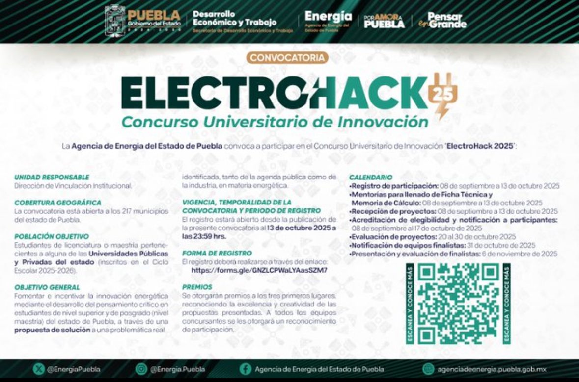 El gobierno humanista del mandatario Alejandro Armenta, a través de la Agencia de Energía del Estado de Puebla, emitió la convocatoria para el Concurso Universitario de Innovación “ElectroHack 2025”, dirigido a estudiantes de licenciatura y maestría de instituciones académicas públicas y privadas de la entidad. El objetivo es impulsar a las juventudes como agentes activos en la construcción de un futuro sostenible, mediante el ingenio, la innovación y el trabajo en equipo para desarrollar soluciones a los retos del sector energético.
