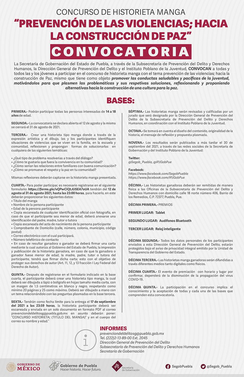 Con el objetivo de promover las conductas saludables y pacíficas de la juventud, la Secretaría de Gobernación (Segob), a través de la Subsecretaría de Prevención del Delito y Derechos Humanos y de la Dirección General de Prevención del Delito, convoca a las y los jóvenes poblanos a participar en la creación de un manga con el tema “Prevención de las violencias, hacia la construcción de paz”.