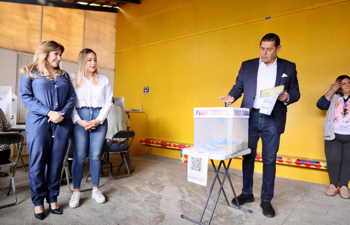 El mandatario estatal acompañado por su esposa Ceci Arellano, presidenta del Patronato del Sistema Estatal DIF, y por su hija Cristy, emitió su voto en la casilla básica, sección 1156, instalada en el Jardín de Niños Despertar, refirió que la legitimidad de dichas elecciones se la dará la ciudadanía. «Siempre será mejor que un millón, dos millones, diez millones de mexicanos elijan a los guardianes de la justicia, al Poder Judicial que un puñado de senadores y la presidencia de la república», puntualizó el gobernador.