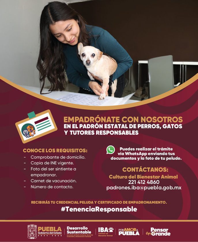 La administración que encabeza Alejandro Armenta, reafirma su compromiso con los seres sintientes e invita a las y los poblanos a realizar su registro de manera voluntaria mediante las redes sociales oficiales del Instituto (@IBAGobPue), vía mensaje de WhatsApp al 221 412 4860 o por correo electrónico a padrones.iba@puebla.gob.mx.