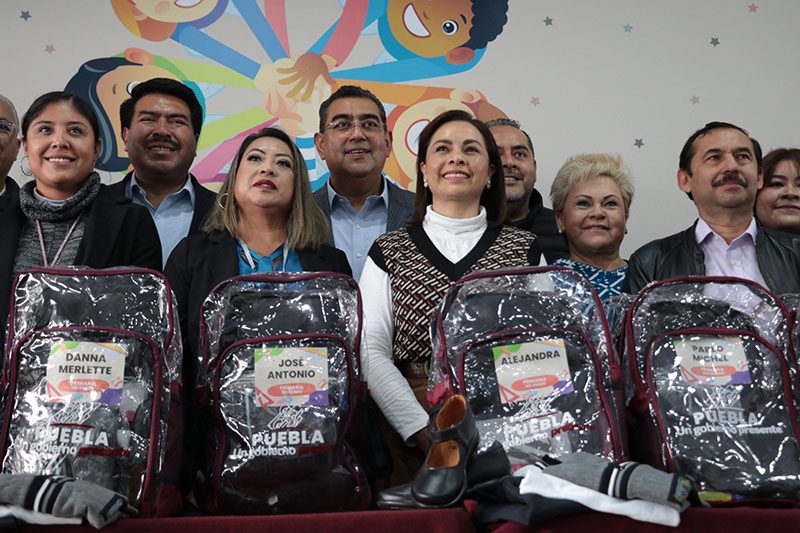 El gobernador Sergio Salomón y la presidenta honoraria del Patronato, Gaby Bonilla presidieron la entrega de claves escolares para las casas de Asistencia, así como el otorgamiento de uniformes y materiales educativos