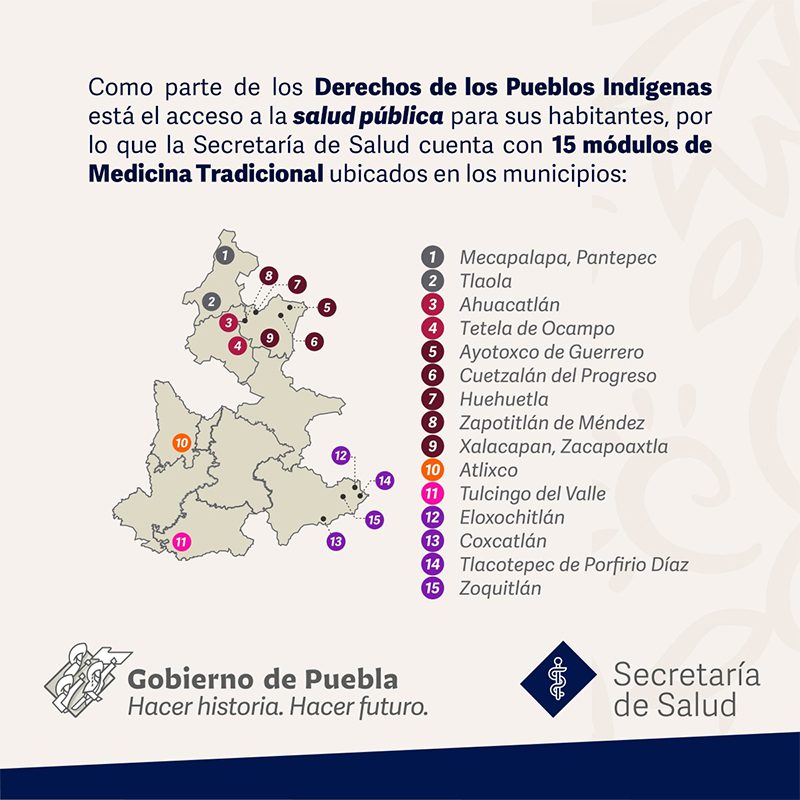 Indicó que, en el primer cuatrimestre del año, hubo un total de 22 mil 544 consultas. La atención de estos módulos dijo, son otorgados por terapeutas tradicionales conocidos como hueseros, curanderos y arteras en los siguientes municipios: Mecapalapa, localidad de Pantepec; Tlaola, Ahuacatlán, Tetela de Ocampo, Ayotoxco de Guerrero, Cuetzalan del Progreso, Huehuetla, Zapotitlán de Méndez, Xalacapan, localidad de Zacapoaxtla; Atlixco, Tulcingo del Valle, Eloxochitlán, Coxcatlán, Tlacotepec de Porfirio Díaz y Zoquitlán.