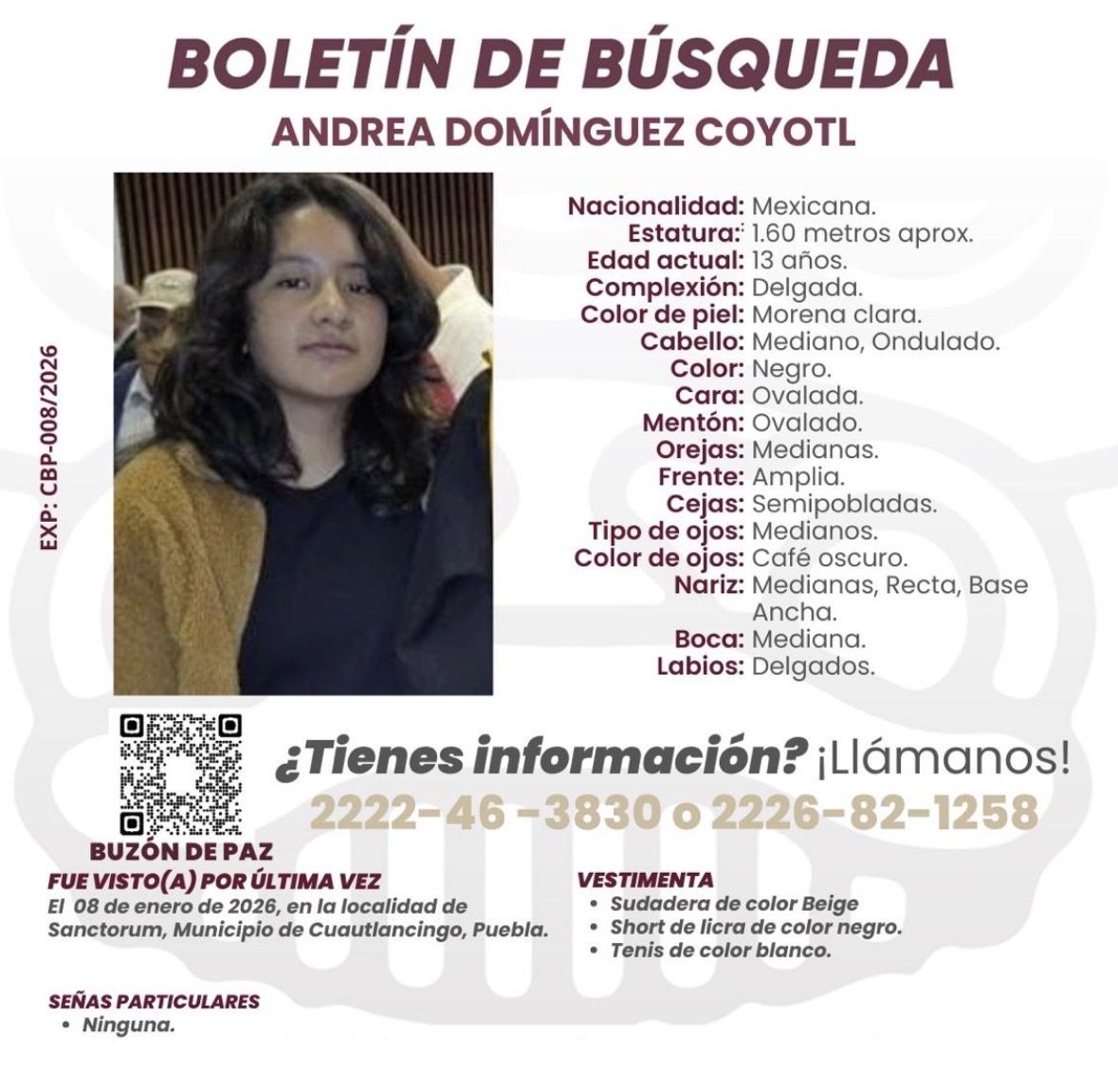 Con motivo de la no localización de Andrea Domínguez Coyotl, se aperturó expediente de búsqueda el 10 de enero, a las 22:30 horas, conforme a los protocolos establecidos, informó la Comisión de Búsqueda de Personas del Estado de Puebla.