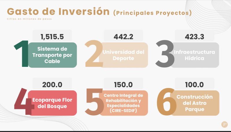 La secretaria de Planeación, Finanzas y Administración, Josefina Morales explicó que los ingresos estatales crecerán 4.1 por ciento gracias a una disciplina fiscal firme y al fortalecimiento de la recaudación sin aumentar cargas tributarias. El presupuesto reserva más de 7 mil 600 millones para obra pública, con proyectos estratégicos como transporte por cable, infraestructura hídrica, la Universidad del Deporte, el Centro Integral de Rehabilitación y el nuevo Astro Parque, todos diseñados para mejorar la calidad de vida y reactivar la economía.