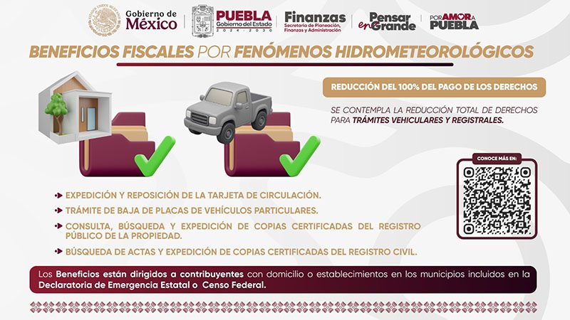 La Secretaría de Planeación, Finanzas y Administración del Gobierno del Estado de Puebla informa que, a través de un Acuerdo publicado en el Periódico Oficial del Estado, se otorgarán beneficios fiscales a las y los ciudadanos de los municipios afectados por fenómenos hidrometeorológicos y geológicos ocurridos del 7 al 11 de octubre de 2025.